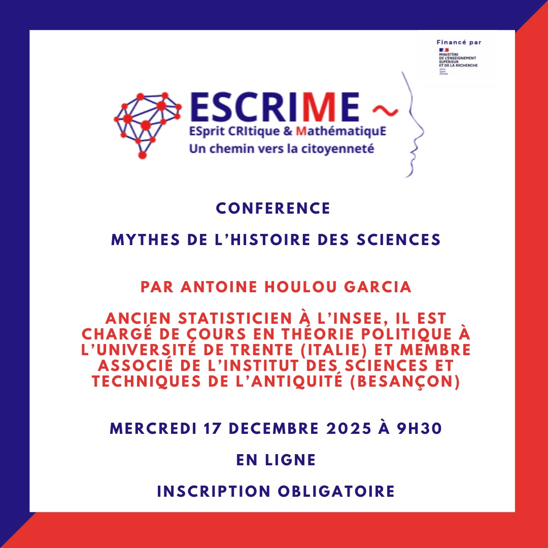 Antoine Houlou Garcia propose une conférence en ligne pour les élèves et enseignants dans le cadre de ESCRIME le mercredi 17 décembre à 9h30, intitulé les mythes dans l'histoire des sciences. "L'histoire des sciences est remplie d'anecdotes savoureuses... qui sont souvent complètement fausses ! La pomme n'est pas tombée sur la tête de Newton (ni… Lire la suite »Conférence d’Antoine Houlou Garcia: les mythes dans l’histoire des sciences